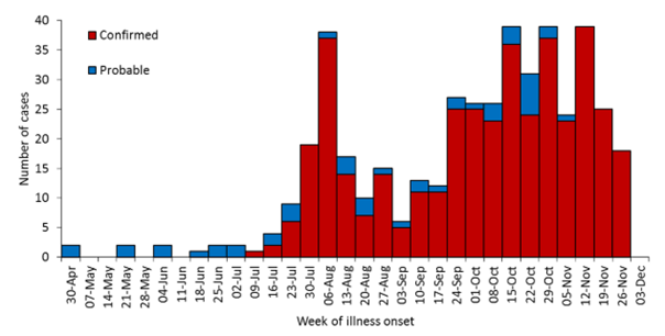 Salgının epidemiyolojik eğrisi (Şekil 2) iki ayrı fazı göstermektedir. İlk aşama Mangina merkezli olup bir ay içinde büyük ölçüde kontrol altına alınmıştır. Birçok alana yayılmış olan ikinci dalga, iki ay boyunca günde yaklaşık 5 yeni vaka ile devam etmiştir. Vaka tespiti ve rapor edilmesinde beklenen gecikmeler göz önüne alındığında, haftalık vaka insidansındaki genel eğilimler en son haftalarda dikkatle yorumlanmalıdır.