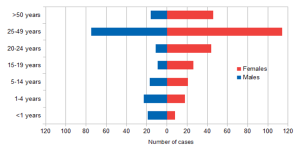 Bu salgın sırasında enfekte olan kadın ve çocukların orantısız sayısına ilişkin kaygılar dile getirilmiştir (Şekil 3). Bugüne kadar, kadınlar cinsiyetin rapor edildiği genel vakaların % 62'sini (280/450) oluşturmuştur. Tüm kadın olguların % 83'ünün (230/277) ≥15 yaşlarında olduğu görülmüştür. Bu kadınların en az 18'i hamile ve 7'si de emziren ya da enfeksiyondan kısa bir süre önce doğum yapmışlardan oluşmuştur. Bir yaşından küçük bebeklerde 27 vaka görülmüş olup bunların % 70'i (19) erkek ve 21'i ölüm vakasıdır (yaşına özgü olgu ölüm oranı% 78). Bir aydan küçük bebeklerde de 9 vaka görülmüştür. 15 yaşından küçük çocuklar vakaların % 24'ünü (106/447) oluşturmuştur.