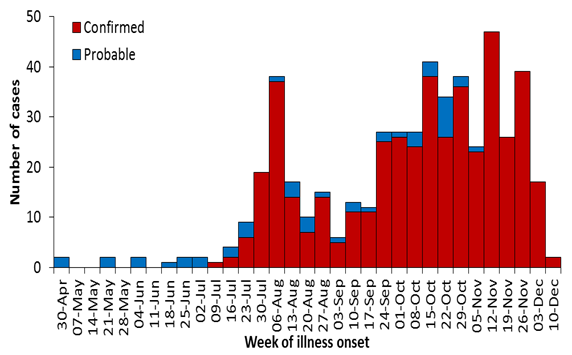 Şekil 2: 11 Aralık 2018 tarihi itibariyle hastalık başlangıcı haftasına göre doğrulanmış ve olası Ebola virüsü hastalığı vakalarıyla ilgili veriler (n=504) *