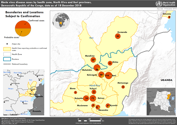 Salgın şu anda, Kuzey Kivu ve Ituri eyaletlerinde 14 sağlık bölgesini kapsayan, coğrafik olarak dağınık bir alanda aktif olarak devam etmektedir. Son 21 gün içinde (27 Kasım - 18 Aralık 2018), 114 yeni doğrulanmış vaka bildirilmiştir: Katwa (31), Beni (18), Komanda (17), Butembo (14), Mabalako (14), Kalunguta (5), Oicha (4), Vuhovi (3), Kyondo (3), Biena (1), Mandima (1), Masereka (1), Musienene (1) ve Mutavanga (1). Ağustos ortasında kümelenme tespit edildiğinden beri sadece Tchomia Sağlık Bölgesinden yeni vaka teyit edilmemiştir. Bu bölgelerdeki salgının artması, özel ve kamu sağlık merkezlerinde sosyal / toplumsal aktarım ve iletim kombinasyonuyla olmuştur.