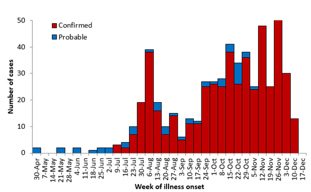 Kümülatif olarak 18 Aralık itibariyle, Kuzey Kivu Eyaletindeki 12 sağlık bölgesinde ve Ituri Eyaletindeki üç sağlık bölgesinde 326 ölüm (vaka ölüm oranı% 59) olmak üzere 549 EVH vakası (501 doğrulanmış ve 48 olası) bildirilmiştir (Şekil 1). Vaka insidansındaki genel eğilimler (Şekil 2), bu bölgelerdeki salgınların sürekliliğini yansıtmakta olup, Ekim ortasından bu yana her hafta ortalama 35 yeni vaka bildirilmektedir.