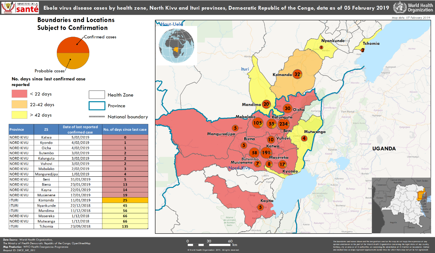 5 Şubat itibariyle, 488 ölüm (toplam vaka ölüm oranı: % 62) dahil olmak üzere 789 EVH vakası (735 onaylı ve 54 olası) rapor edilmiştir. Bugüne kadar, 267 kişi Ebola Tedavi Merkezleri'nden (ETC) taburcu edilmiş ve hayatta kalanların izlenmesi ve desteklenmesi için özel bir programa dahil edilmiştir. Yaş ve cinsiyetleri bildirilmiş vakaların % 58'i (454/788) kadın, % 30'u (232/786) 18 yaşından küçük olup bu sayıya 5 yaşın altındaki 116 çocuk dahildir. Katwa (4) ve Kalunguta'da (1) 5 yeni sağlık çalışanı enfeksiyonu bildirilmiş olup bugüne kadar hastalıktan toplam 67 sağlık çalışanı etkilenmiştir.