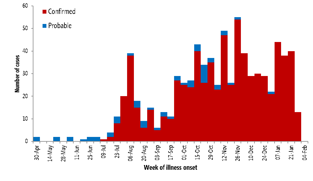 Şekil 1: 5 Şubat 2019 tarihi itibariyle hastalık başlangıcı haftasına göre doğrulanmış ve olası Ebola virüsü hastalığı vakalarıyla ilgili veriler (n=789)*