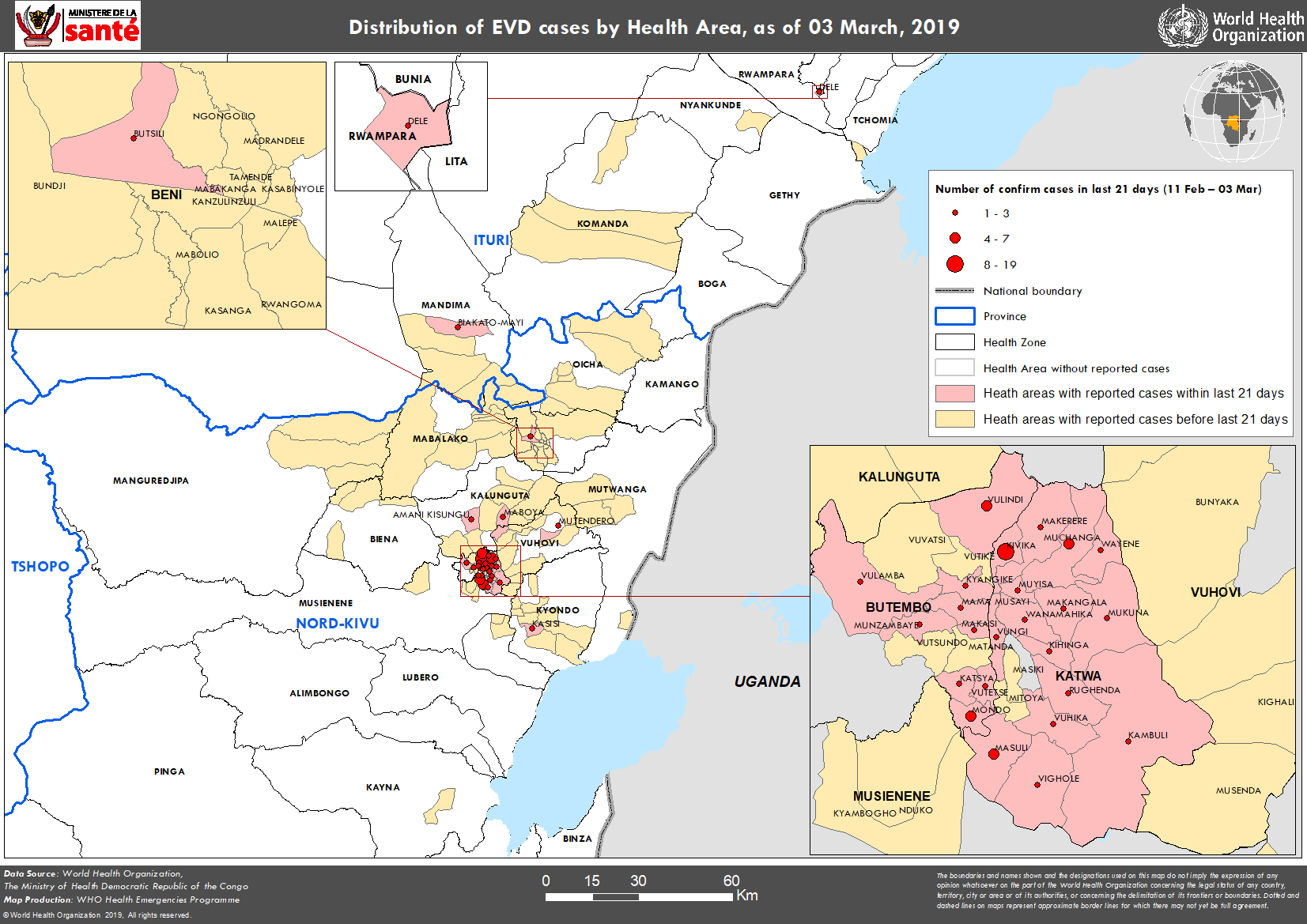Ebola virüsü hastalığı (EVH) salgını orta şiddette devam etmektedir. Katwa ve Butembo, endişe verici ana sağlık bölgeleri olmaya devam ederken, aynı zamanda, coğrafi olarak dağınık çeşitli yerlerde küçük vaka grupları görülmektedir. Son 21 gün boyunca (13 Şubat -5 Mart 2019), 9 sağlık bölgesindeki 31 sağlık alanından 76 yeni doğrulanmış ve muhtemel vaka bildirilmiştir (Şekil 1): Katwa (44), Butembo (17), Mandima ( 6), Masereka (3), Kalunguta (2), Beni (1), Vuhovi (1), Kyondo (1) ve Rwampara (1). Mandima sağlık bölgesinde daha önce hastalıktan etkilenmemiş bir köyde bir vaka grubu görülmüş olup son görülen 5 vakayla epidemiyolojik olarak bağlantılıdır ve 6'ncı vaka hastalığa Butembo'da maruz kalmış gibi gözükmektedir; Bununla birlikte, hastalığın daha fazla yayılma riski hala yüksektir. Benzer şekilde, Masereka'daki son vakalar (ikisi doğrulanmış ve biri olası vaka) Butembo bulaşma zincirinden kaynaklanmaktadır. Bu olaylar, yanıt ekiplerinin yeni vakaları hızlı bir şekilde tespit etmek ve ileriye dönük iletimi önlemek için, düşük vaka insidansına sahip olan bölgeler de dahil olmak üzere tüm alanlarda aktif kalmasının önemini vurgulamaktadır.
