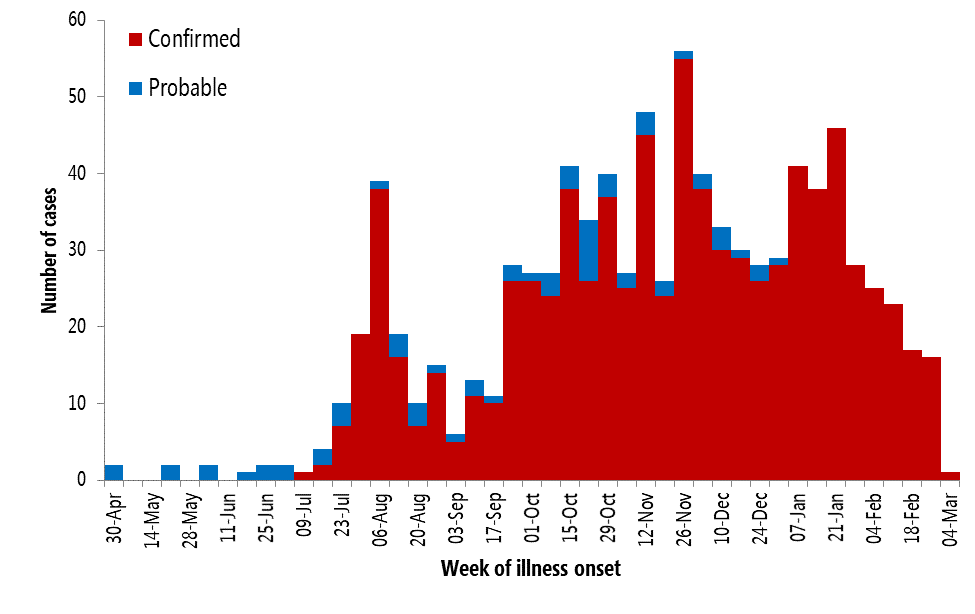 Şekil 2: 5 Mart 2019 tarihi itibariyle hastalık başlangıcı haftasına göre doğrulanmış ve olası Ebola virüsü hastalığı vakalarıyla ilgili veriler
