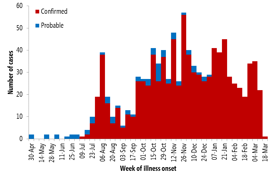 Şekil 1: 19 Mart 2019 tarihi itibariyle hastalık başlangıcı haftasına göre doğrulanmış ve olası Ebola virüsü hastalığı vakalarıyla ilgili veriler