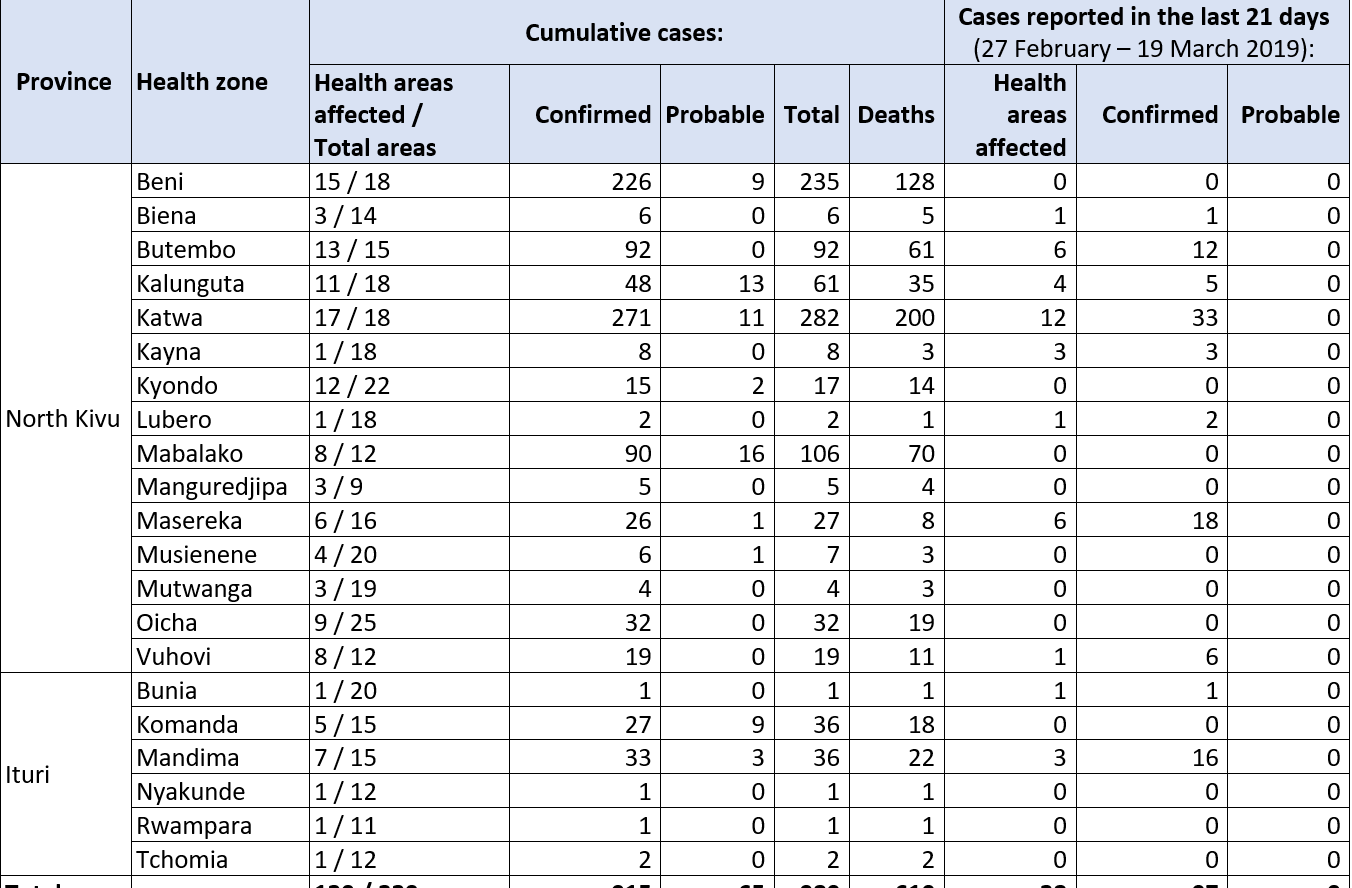 Salgının başlamasından 19 Mart 2019’a kadar,% 57'si (554) kadın,% 30'u (293) 18 yaşından küçük çocuklar olan 980 EVH vakası (915 doğrulanmış ve 65 olası) rapor edilmiştir. Kümülatif olarak, North Kivu ve İturi İllerinde 21 sağlık bölgesindeki 339 sağlık alanından 130’undan vaka bildirilmiştir (Tablo1). Genel olarak, 610 ölüm (vaka ölüm oranı:% 62) bildirilmiş ve 317 hasta Ebola Tedavi Merkezi'nden (ETM) taburcu edilmiştir.