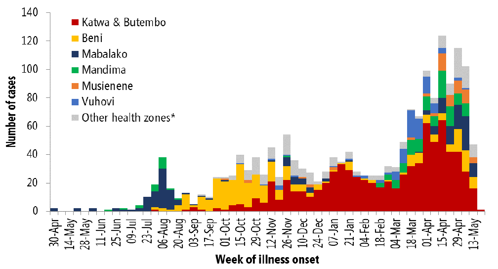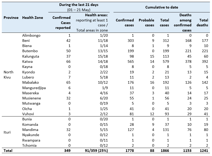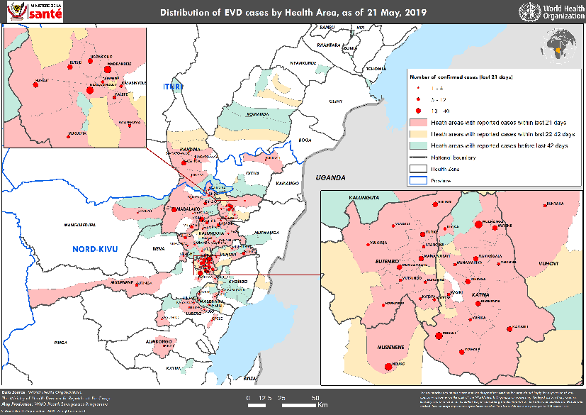 Geçtiğimiz 3 hafta boyunca, raporlar, 7 ana sorunlu alanda hastalık iletiminin en yoğun olduğunu göstermektedir: Beni, Butembo, Kalunguta, Katwa, Mabalako, Mandima ve Musienene. Toplu olarak, bu sağlık bölgeleri, 1 - 21 Mayıs 2019 tarihleri arasında son 21 gün içinde bildirilen 349 vakanın büyük çoğunluğunu (% 93) oluşturmaktadır (Şekil 1 ve Tablo 1). Bu dönemde, bugüne kadar etkilenen 22 sağlık bölgesinin 15'inde 91 sağlık alanından yeni vakalar bildirilmiştir (Şekil 2).