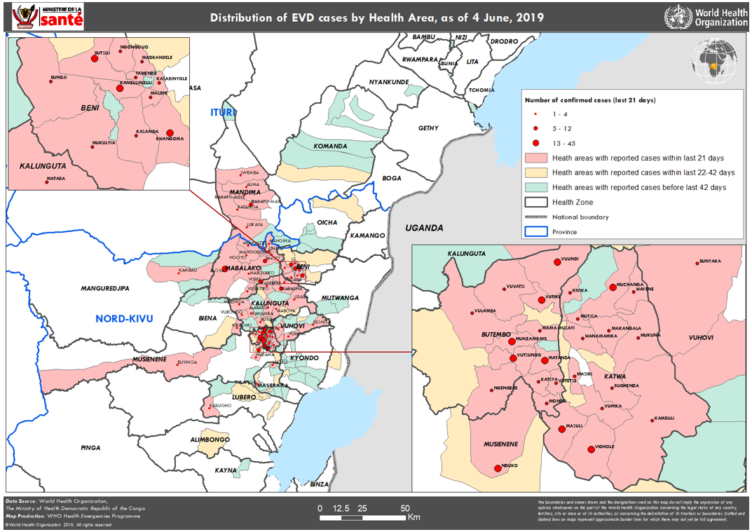 15 Mayıs - 4 Haziran 2019 tarihleri arasındaki 21 günde, 12 sağlık bölgesindeki 80 sağlık alanı, Kuzey Kivu ve Ituri illerindeki 664 sağlık alanının% 12'sini temsil eden yeni vakalar bildirmiştir (Tablo 1 ve Şekil 2). Bu dönemde, çoğunluğu Mabalako (% 27, n = 75), Butembo (% 23, n = 63), Katwa(% 16, n = 44), Beni (% 11, n = 30), Kalunguta (% 8, n = 23), Mandima (% 7, n = 19) ve Musienene (% 5, n = 14) sağlık bölgelerinden olmak üzere toplam 280 doğrulanmış vaka bildirilmiştir.