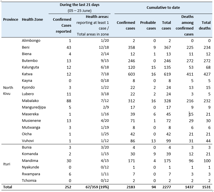 21 gün içinde, 5-25 Haziran 2019 arasında, 19 sağlık bölgesindeki 67 sağlık alanı yeni vakalar bildirmiş olup, bu bölgeler Kuzey Kivu ve Ituri illerindeki 664 sağlık alanının % 10'unu temsil etmektedir (Şekil 2). Bu dönemde, çoğunluğu Mabalako (% 35, n = 88), Beni (% 17, n = 43), Mandima (% 12, n = 30), Butembo (% 5, n = 13), Musienen (% 5, n = 13), Kalunguta (% 5, n = 12) ve Katwa (% 5, n = 12) sağlık bölgelerinde olmak üzere toplam 252 doğrulanmış vaka bildirilmiştir. 25 Haziran 2019 tarihi itibariyle 2.183 doğrulanmış ve 94 olası vaka olmak üzere toplam 2.277 EVH vakası bildirilmiştir (Tablo 1). Doğrulanmış vakalar arasında 1.437 ölüm olmak üzere toplam 1.531 ölüm rapor edilmiştir (toplam vaka ölüm oranı% 67). Yaşları ve cinsiyetleri bilinen doğrulanmış ve olası 2.277 vakanın % 57'si (1.287) kadın ve % 29'u (663) 18 yaşından küçük çocuklardan oluşmaktadır. Sağlık çalışanları arasında görülen vakalar artmakta olup enfekte olanların toplam sayısı 129’a yükselmiştir (toplam vakaların% 6'sı).