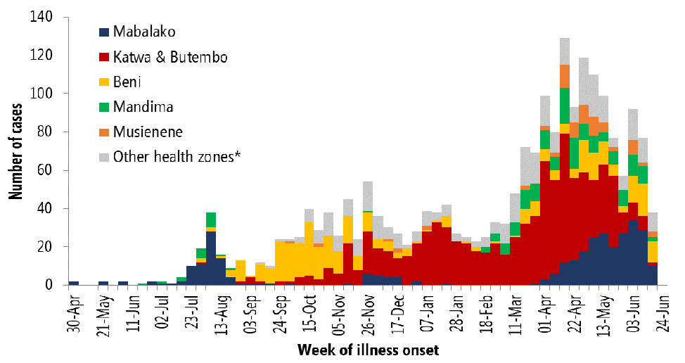 Mabalako'da, 5-25 Haziran tarihleri arasında 61'i Aloya sağlık bölgesinde yoğunlaşan toplam 88 doğrulanmış vaka bildirilmiştir. Çok sayıda iletim zincirinin aile bağlantılarıyla ilgili olduğu belirlenmiş ve 15 vaka sağlık tesisi ile ilgili enfeksiyonlarla ilişkilendirilmiştir. Şu anda, Mabalako'da mevcut ana zorluklar, kayıtlı vakaların takibi ve tespit edilen yeni EVH vakalarının sayısına bağlı olarak bildirilen düşük uyarı sayıları etrafında dönmektedir.