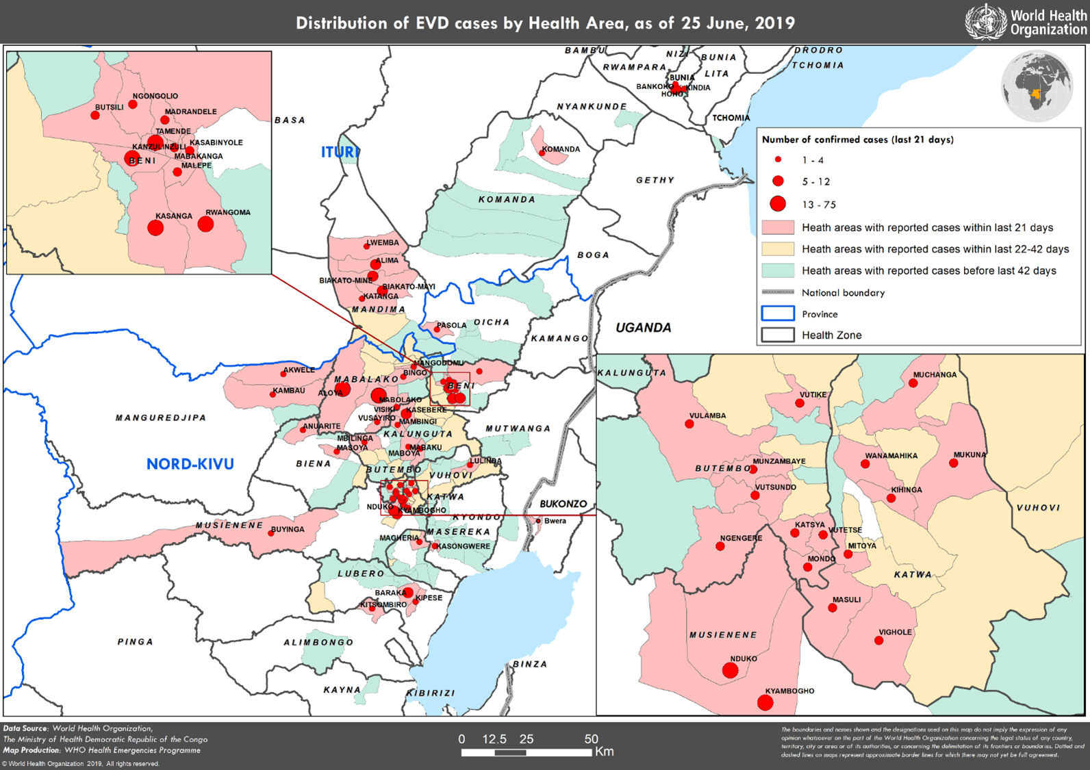 Bu hafta, Mabalako'nun, özellikle Aloya sağlık bölgesinin ve EVH vakalarını bildiren ilk sağlık bölgeleri olan Mandima'nın sorunlu bölgeleri kaygı vericidir. Son 24 gün içinde yeni bir vaka bildirmemiş olan Vuhovi gibi alanlarda, sporadik olarak hastalığın yeniden görülmesi, gelişen durumu daha da karmaşık hale getirmektedir. Hastalığın görülmediği uzunca bir süreden sonra EVH vakalarında benzer bir artış yaşayan diğer bölgeler arasında Komanda ve Masereka da bulunmaktadır.