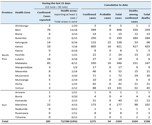 21 gün içinde, 12 Haziran-2 Temmuz 2019 tarihleri arasında, 20 sağlık bölgesindeki 73 sağlık alanından yeni vakalar bildirilmiş olup, bu bölgeler Kuzey Kivu ve Ituri illerindeki 664 sağlık alanının % 11'ini temsil etmektedir (Şekil 2). Bu dönemde, çoğunluğu Beni (27%, n=76), Mandima (8%, n=23), Lubero (6%, n=16) ve Kalunguta (5%, n=14) sağlık bölgelerinde olmak üzere toplam 285(%30, n=85) vaka bildirilmiştir. 02 Temmuz 2019 tarihi itibariyle, 2.275 onaylanmış ve 94 olası vaka olmak üzere toplam 2.369 EVH vakası bildirilmiştir (Tablo 1). Doğrulanmış vakalar arasında 1.504 ölüm olmak üzere toplam 1.598 ölüm rapor edilmiştir (toplam vaka ölüm oranı % 68). Yaşları ve cinsiyetleri bilinen doğrulanmış ve olası 2.369 vakanın % 56'sı (1.334) kadın ve % 29'u (691) 18 yaşından küçük çocuklardan oluşmaktadır. Sağlık çalışanları arasında görülen vakalar artmakta olup enfekte olanların toplam sayısı 130’a yükselmiştir (toplam vakaların% 6'sı).