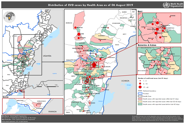 Demokratik Kongo Cumhuriyeti'nin Kuzey Kivu ve Ituri illerinde Ebola virüsü hastalığı (EVH) salgını, son 6 hafta boyunca haftada ortalama 86 vaka ile son haftalara benzer bir iletim yoğunluğu ile bu hafta da devam etmiştir. Şu anda Demokratik Kongo Cumhuriyeti dışında doğrulanmış hiçbir EVH vakası yoktur. 6 Ağustos 2019 tarihi itibariyle, 1.866 kişinin öldüğü (genel vaka ölüm oranı %67), 2.687 doğrulanmış ve 94 olası vaka olmak üzere toplam 2.781 EVH vakası bildirilmiştir.