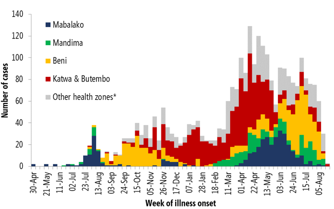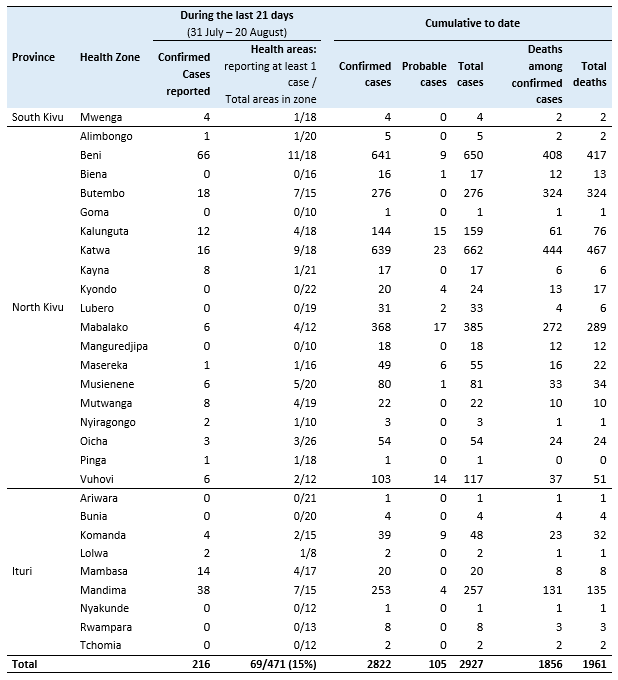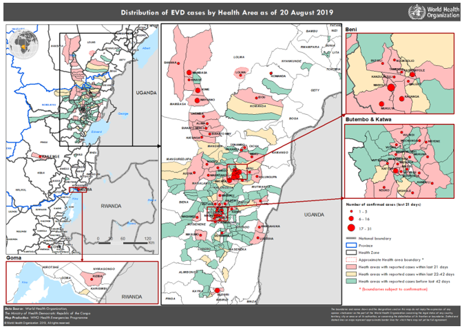 Demokratik Kongo Cumhuriyeti'nin Kuzey Kivu ve Ituri illerinde Ebola virüsü hastalığı (EVH) salgını benzer bir iletim yoğunluğu ile bu hafta da devam etmiştir (Şekil 1). Salgının son birkaç haftası vakaların yeni sağlık bölgelerine coğrafi olarak genişlemesiyle karakterize olup yüksek vaka sayılarını, süregelen yerel hastalık bulaşını ve vakaların Beni, Mandima ve Butembo salgın odak noktalarına ve odak noktalarından başka yerlere sağlık bölgeleri arasındaki hareketi görmeye devam ediyoruz. 31 Temmuz - 20 Ağustos 2019 tarihleri arasında geçen 21 günde, 19 sağlık bölgesindeki 69 sağlık alanı yeni vakalar bildirmiştir (Tablo 1, Şekil 2). Bu dönemde, çoğunluğu Beni (% 31, n = 66), Mandima (% 18, n = 38) ve Butembo (% 8, n=18 =) sağlık bölgelerinden toplam 216 doğrulanmış vaka bildirilmiştir. Geçiş riskinin yüksek olması, son 21 gün içinde 14 vaka bildiren Mambasa kentinde ortaya çıkan bir kümelenmeyle de bağlantılıdır. Yanıt, bu hastalık odak noktalarına erken vaka tespiti ve ayrıntılı inceleme, temaslıların tespiti ve takibi ve yerel topluluklarla engaje olmak yoluyla cevap vermeye devam etmektedir.
