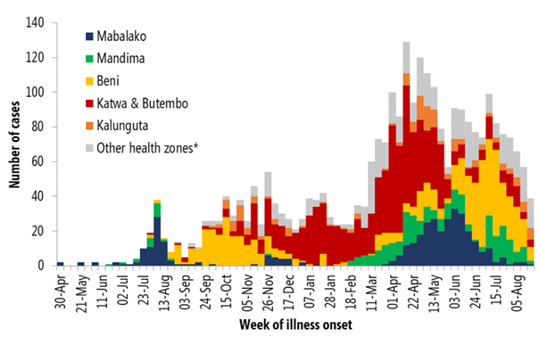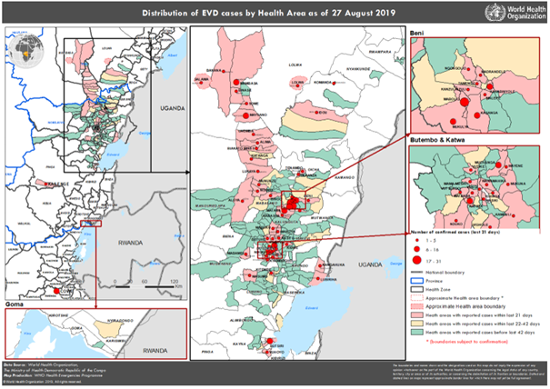 Demokratik Kongo Cumhuriyeti'nin Kuzey Kivu ve Ituri illerinde Ebola virüsü hastalığı (EVH) salgını geçtiğimiz 6 haftaya benzer bir iletim yoğunluğu ve haftada ortalama 77 vakayla bu hafta da devam etmiştir.7 Ağustos - 27 Ağustos 2019 tarihleri arasında geçen 21 günde, 18 sağlık bölgesindeki 66 sağlık alanı yeni vakalar bildirmiştir.