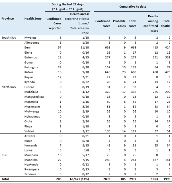 Demokratik Kongo Cumhuriyeti'nin Kuzey Kivu ve Ituri illerinde Ebola virüsü hastalığı (EVH) salgını geçtiğimiz 6 haftaya benzer bir iletim yoğunluğu ve haftada ortalama 77 vakayla bu hafta da devam etmiştir (Şekil 1). 7 Ağustos - 27 Ağustos 2019 tarihleri arasında geçen 21 günde, 18 sağlık bölgesindeki 66 sağlık alanı yeni vakalar bildirmiştir (Tablo 1, Şekil 2). Bu dönemde, çoğunluğu Beni (% 28, n = 57), Mandima'dan (% 11, n = 22) ve Kalunguta (% 11, n=22 =) sağlık bölgelerinden toplam 203 doğrulanmış vaka bildirilmiştir. Ayrıca, son 21 gün içinde bildirilen 16 vakayla birlikte, Mambasa gelişen bir hastalık odak noktası olarak belirtiler göstermeye devam etmektedir. Yanıt, bu hastalık odak noktalarına erken vaka tespiti ve ayrıntılı inceleme, temaslıların tespiti ve takibi ve yerel topluluklarla engaje olmak yoluyla cevap vermeye devam etmektedir.