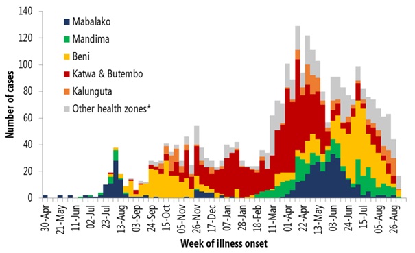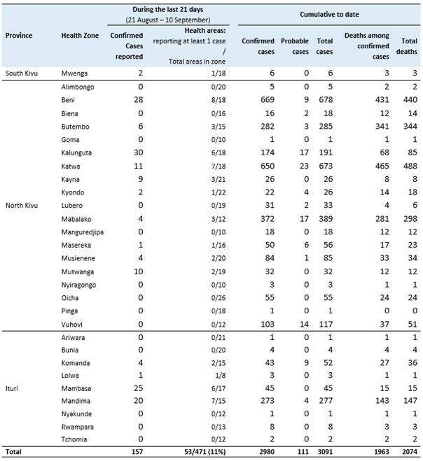 Demokratik Kongo Cumhuriyeti'ndeki Ebola virüsü hastalığı (EVH) iletimi, geçen hafta bildirilen 40 yeni doğrulanmış vaka ile azalmaya devam etmiş olup bu, Mart 2019’dan bu yana en düşük haftalık orandır. Son 21 gün boyunca (21 Ağustos – 10 Eylül 2019 tarihleri arasında) 15 sağlık bölgesinden toplam 157 doğrulanmış vaka bildirilmiştir. 10 Eylül 2019 tarihi itibariyle, 2.074 kişinin öldüğü , 2.980 doğrulanmış ve 111 olası vaka olmak üzere toplam 3.091 EVH vakası bildirilmiştir.