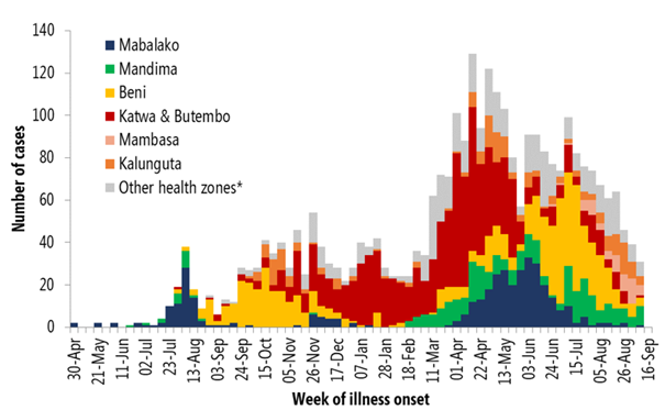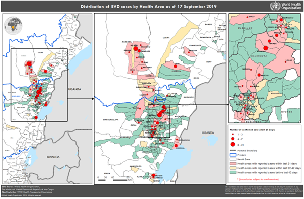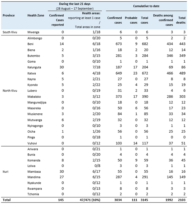 Son 21 gün boyunca (28 Ağustos – 17 Eylül 2019 tarihleri arasında) çoğunluğu Kalunguta (% 21, = 30), Mambasa (% 21, n = 30) ve Mandima (% 19, n = 27) sağlık bölgelerinden olmak üzere 14 sağlık bölgesinden toplam 145 doğrulanmış vaka bildirilmiştir (Tablo 1, Şekil 2). Son 21 gündeki 14 vakayla, Beni Sağlık Bölgesinden gelen vakalarda nispi bir düşüş yaşanmıştır. Masereka ve Lolwa Sağlık Bölgeleri, 21 gün boyunca doğrulanmış yeni bir EVH vakası olmadan geçirerek hastalıktan temizlenmiştir.
