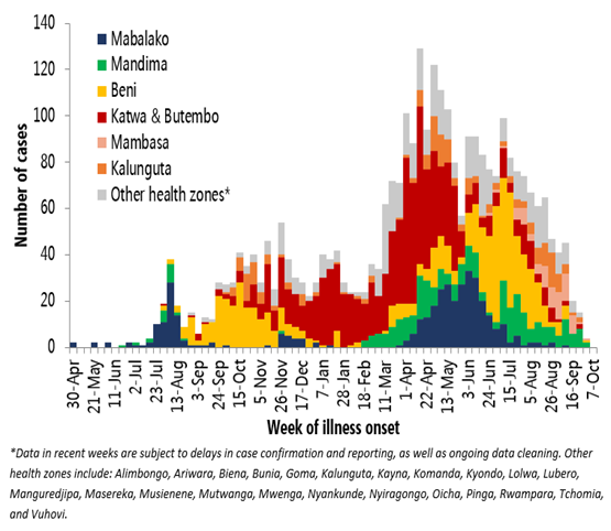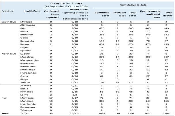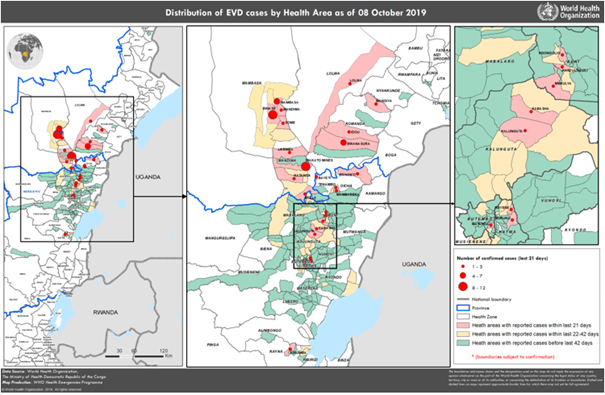 Bildirilen Ebola virüsü hastalığı (EVH) vakalarının sayısı, geçtiğimiz haftalarda sürekli olarak azalırken, 30 Eylül - 6 Ekim arasındaki epidemiyolojik haftada Kuzey Kivu ve Ituri illerinde 14 yeni doğrulanmış vaka bildirilmiştir . 8 Ekim 2019 tarihi itibariyle, 2.144 kişinin öldüğü (genel vaka ölüm oranı %67), 3.093 doğrulanmış ve 114 olası vaka olmak üzere toplam 3.207 EVH vakası rapor edilmiştir.
