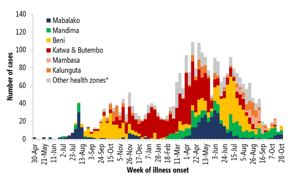 Son 21 gün boyunca (16 Ekim – 5 Kasım arasında), İturi ve North Kivu illerindeki aktif 7 sağlık bölgesinden toplam 54 doğrulanmış vaka rapor edilmiş olup (Tablo 1, Şekil 2), vakaların çoğu 4 sağlık bölgesinden rapor edilmiştir: Mandima (% 39) %, n = 21), Mabalako (% 31, n = 17), Beni (%11, n=6) ve Mambasa (% 11, n = 6). Bu vakaların büyük çoğunluğu (% 83) Mandima Sağlık Bölgesi'ndeki Biakato Madenleri Sağlık Alanına, geri kalan 10 vaka ise Binase, Katwa ve Lwemba Sağlık Alanlarındaki bilinen bulaşma zincirleriyle ilişkilidir.