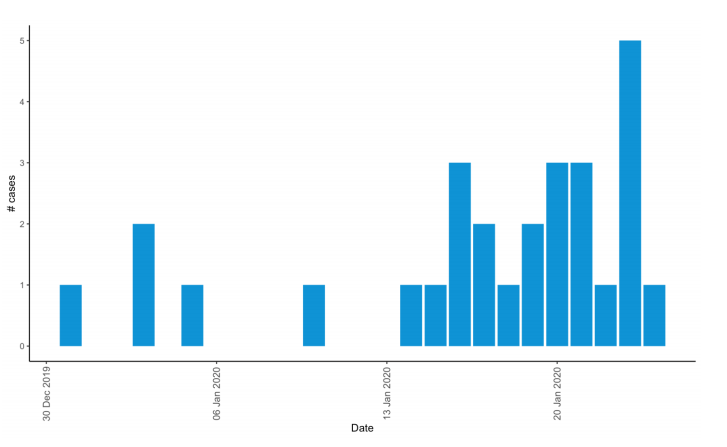 Çin dışında tespit edilen 37 vakadan 3'ü semptomlar başlamadan tespit edilmiş olup diğer 34 hastanın 28'i hakkında semptom tarihi bilgisi mevcuttur. Bu vakalar için salgın, salgın eğrisi (epidemik eğri) Şekil 2'de gösterilmiştir.