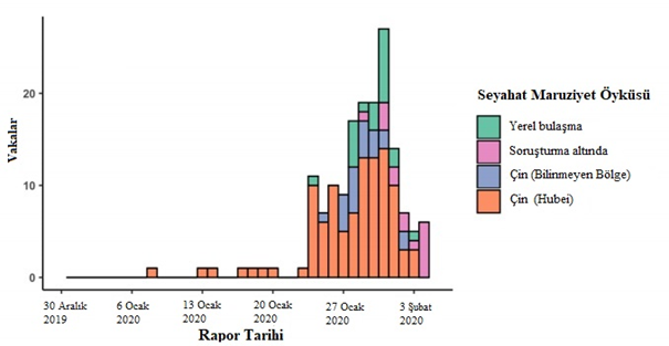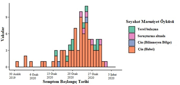 Şekil 2 için not: Çin dışında bildirilen 159 vakanın 12'si asemptomatikken tespit edilmiştir. Geri kalan 147 vaka için, başlangıç tarihi hakkında bilgi sadece epidemiyolojik eğride sunulan 93 vaka için mevcuttur.