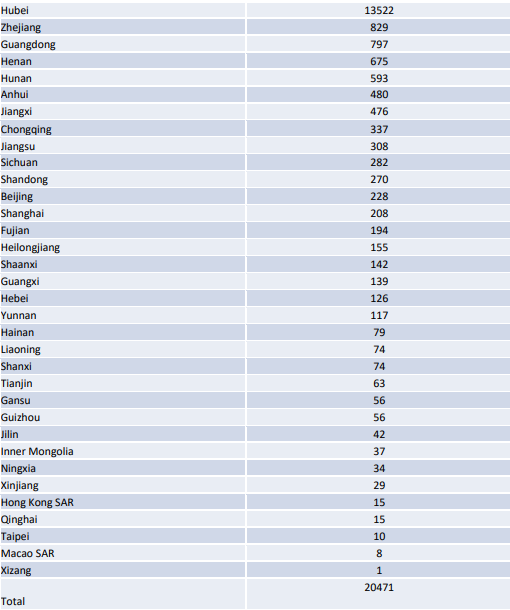 Tablo 1. Çin'deki vilayetler, bölgeler ve şehirler tarafından bildirilen 2019-nCoV akut solunum hastalığı vakaları, 4 Şubat 2020.