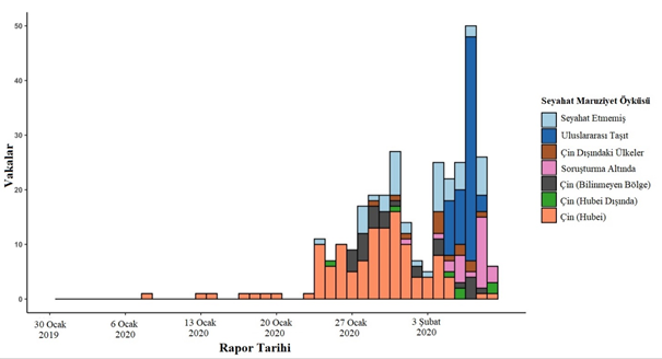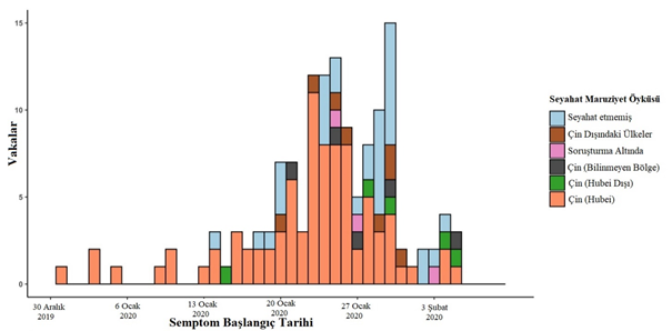 Şekil 2 için not: Çin dışında bildirilen 307 vakanın 16’sı asemptomatikken tespit edilmiştir. Geri kalan 291 vaka için, başlangıç tarihi hakkında bilgi sadece epidemiyolojik eğride sunulan 138 vaka için mevcuttur.