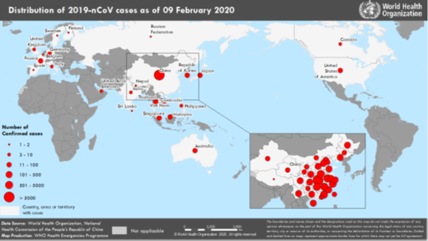 Şekil 1. 09 Şubat 2020 itibariyle doğrulanmış 2019-nCoV vakalarının bildirildiği ülkeler, yönetim bölgeleri veya bölgeler