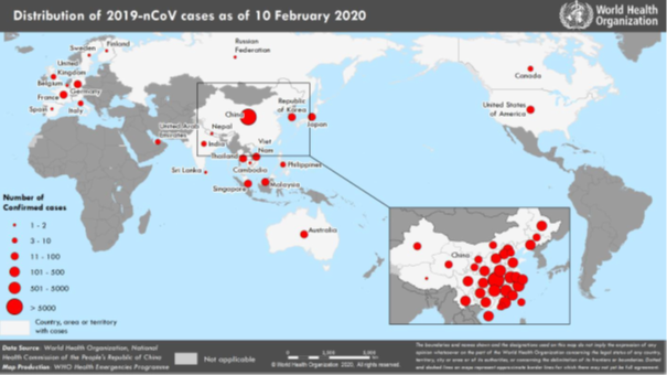 Şekil 1. 10 Şubat 2020 itibariyle doğrulanmış 2019-nCoV vakalarının bildirildiği ülkeler, yönetim bölgeleri veya bölgeler