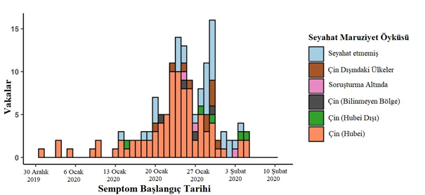 Şekil 2 için not: Çin dışında bildirilen 319 vakanın 16’sı asemptomatikken tespit edilmiştir. Geri kalan 203 vaka için, başlangıç tarihi hakkında bilgi sadece epidemiyolojik eğride sunulan 144 vaka için mevcuttur.