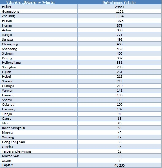Tablo 1. Çin'deki vilayetler, bölgeler ve şehirler tarafından bildirilen 2019-nCoV akut solunum hastalığı vakaları, 10 Şubat 2020