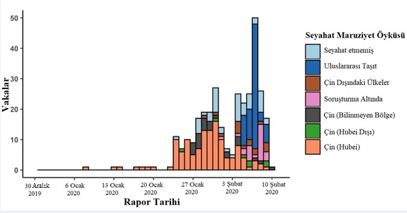 Şekil 3: Raporlama ve seyahat geçmişine göre Çin dışında tespit edilen 2019-nCoV vakalarının (n = 319) epidemik eğrisi, 10 Şubat 2020