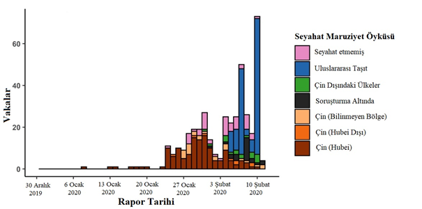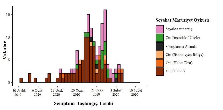 Şekil 2 için not: Çin dışında bildirilen 395 vakanın 16’sı asemptomatikken tespit edilmiştir. Geri kalan 379 vaka için, başlangıç tarihi hakkında bilgi sadece epidemiyolojik eğride sunulan 150 vaka için mevcuttur.