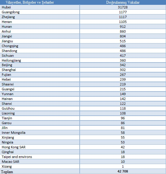 Tablo 1. Çin'deki vilayetler, bölgeler ve şehirler tarafından bildirilen 2019-nCoV akut solunum hastalığı vakaları, 11 Şubat 2020