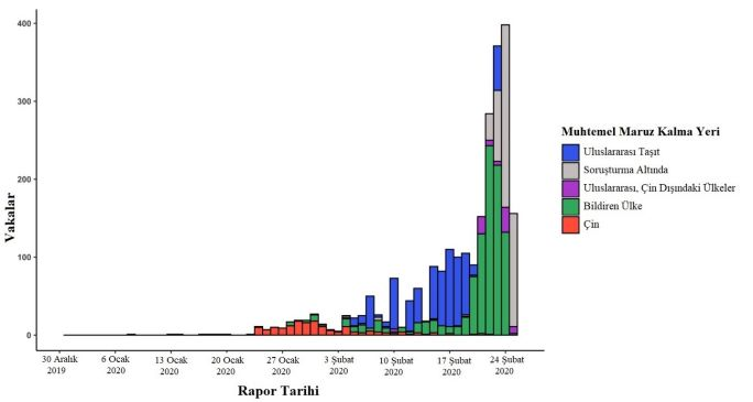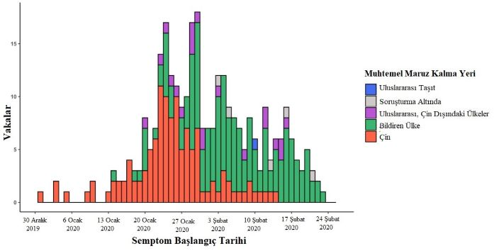 Şekil 2 için not: Çin dışında bildirilen 2459 vakanın 86’sı asemptomatikken tespit edilmiştir. Geri kalan 2373 vaka için, başlangıç tarihi hakkında bilgi sadece epidemiyolojik eğride sunulan 303 vaka için mevcuttur.