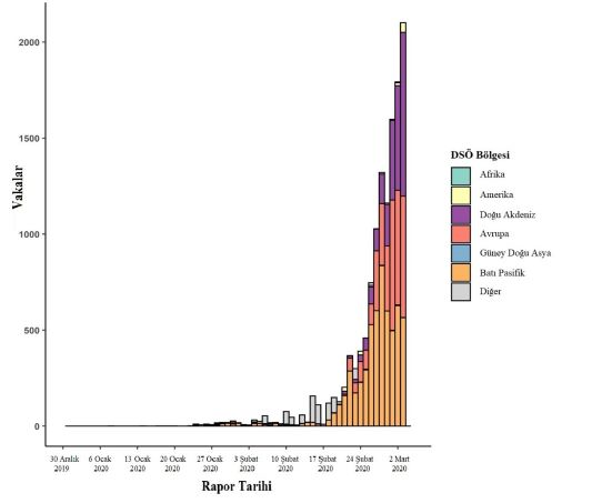 Şekil 2. 3 Mart 2020 tarihine kadar tam rapor günleriyle, Çin dışında bildirilen, doğrulanmış COVID-19 vakalarının (n=12.668), rapor tarihine ve DSÖ bölgesine göre epidemik eğrisi