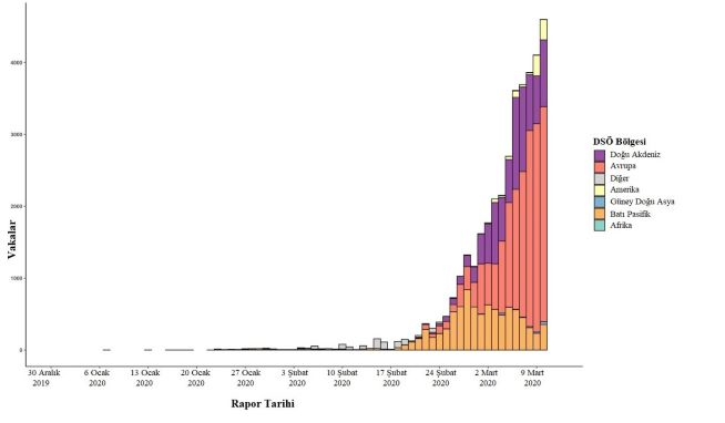 Şekil 2. 11 Mart 2020 tarihine kadar tam rapor günleriyle, Çin dışında bildirilen, doğrulanmış COVID-19 vakalarının, rapor tarihine ve DSÖ bölgesine göre epidemik eğrisi