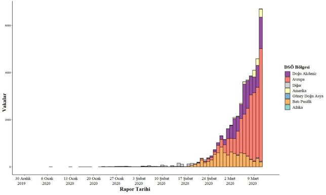 Şekil 2. 12 Mart 2020 tarihine kadar tam rapor günleriyle, Çin dışında bildirilen, doğrulanmış COVID-19 vakalarının (n=44.067), rapor tarihine ve DSÖ bölgesine göre epidemik eğrisi