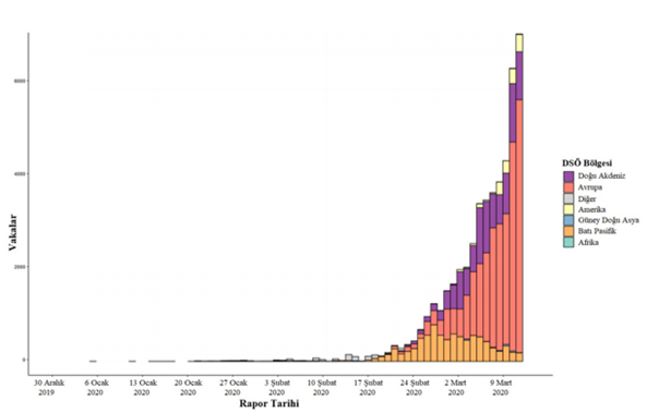 Şekil 2. 13 Mart 2020 tarihine kadar tam rapor günleriyle, Çin dışında bildirilen, doğrulanmış COVID-19 vakalarının (n=44.067), rapor tarihine ve DSÖ bölgesine göre epidemik eğrisi