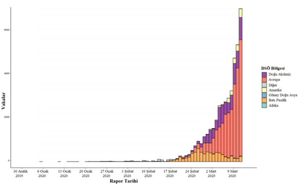 Şekil 2. 14 Mart 2020 tarihine kadar tam rapor günleriyle, Çin dışında bildirilen, doğrulanmış COVID-19 vakalarının (n=44.067), rapor tarihine ve DSÖ bölgesine göre epidemik eğrisi