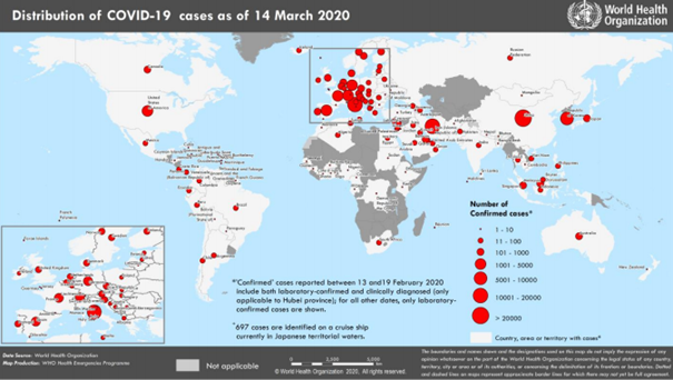 Şekil 1. 14 Mart 2020 itibariyle doğrulanmış COVID-19 vakalarının bildirildiği ülkeler, yönetim bölgeleri veya bölgeler