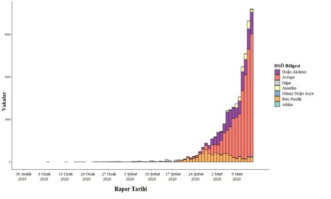 Şekil 2. 15 Mart 2020 tarihine kadar tam rapor günleriyle, Çin dışında bildirilen, doğrulanmış COVID-19 vakalarının (n=72.469), rapor tarihine ve DSÖ bölgesine göre epidemik eğrisi