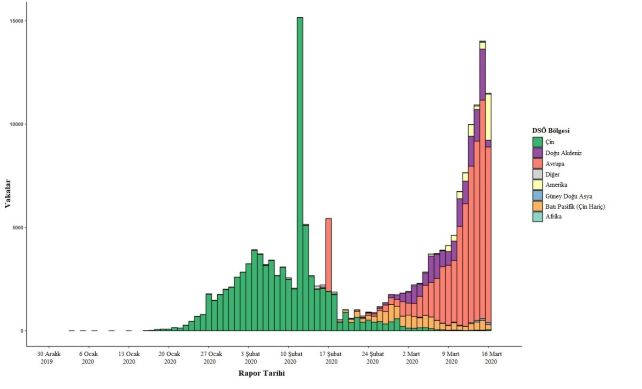 Şekil 2. 17 Mart 2020 tarihine kadar tam rapor günleriyle, doğrulanmış COVID-19 vakalarının, rapor tarihine ve DSÖ bölgesine göre epidemik eğrisi