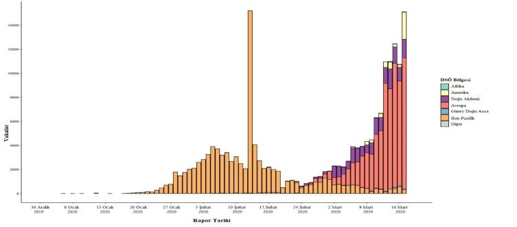 Şekil 2. 18 Mart 2020 tarihine kadar tam rapor günleriyle, doğrulanmış COVID-19 vakalarının, rapor tarihine ve DSÖ bölgesine göre epidemik eğrisi
