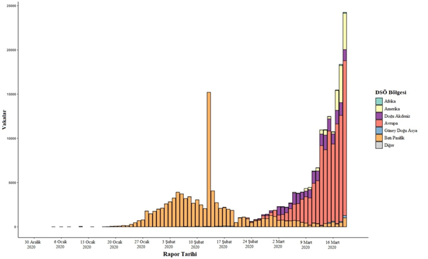 Şekil 2. 19 Mart 2020 tarihine kadar tam rapor günleriyle, doğrulanmış COVID-19 vakalarının, rapor tarihine ve DSÖ bölgesine göre epidemik eğrisi