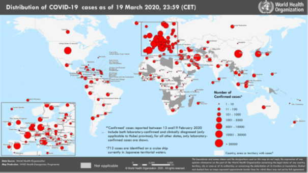 Şekil 1. Doğrulanmış COVID-19 vakalarının bildirildiği ülkeler, yönetim bölgeleri veya bölgeler,19.03.2020
