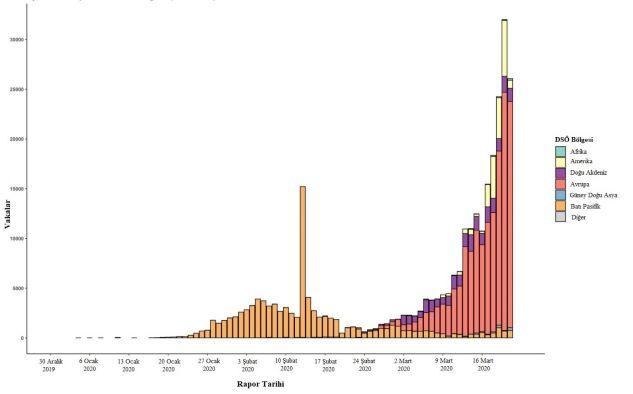 Şekil 2. 21 Mart 2020 tarihine kadar tam rapor günleriyle, doğrulanmış COVID-19 vakalarının, rapor tarihine ve DSÖ bölgesine göre epidemik eğrisi