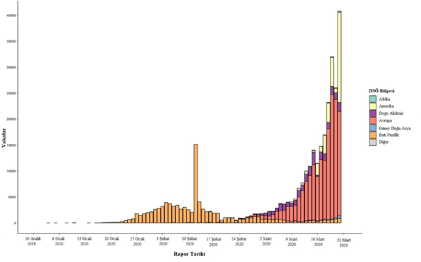 Şekil 2. 23 Mart 2020 tarihine kadar tam rapor günleriyle, doğrulanmış COVID-19 vakalarının, rapor tarihine ve DSÖ bölgesine göre epidemik eğrisi